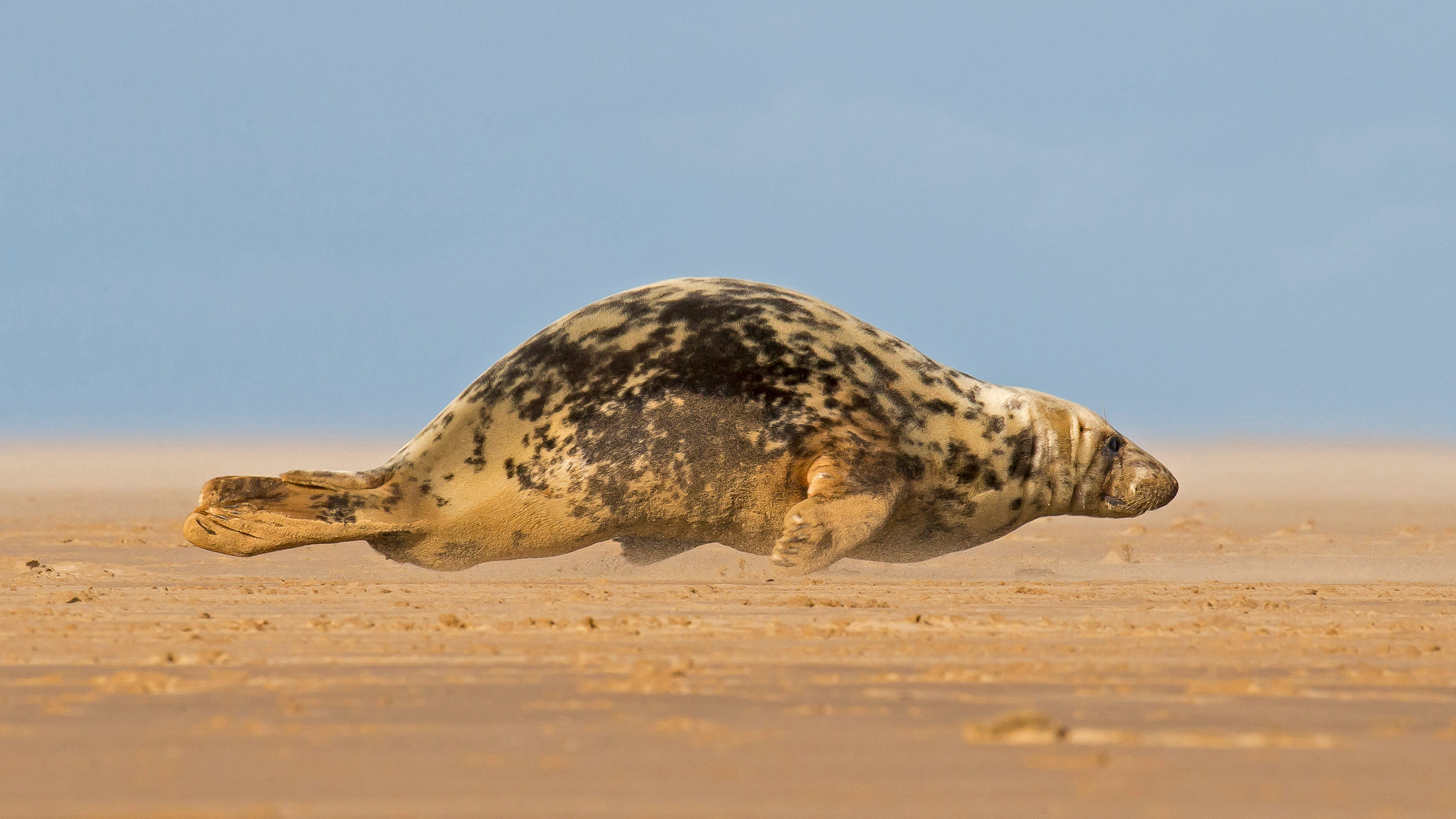 Grey seal hitching itself over the beach at Donna Nook, North Lincolnshire, England (© Frederic Desmette/Minden Pictures)