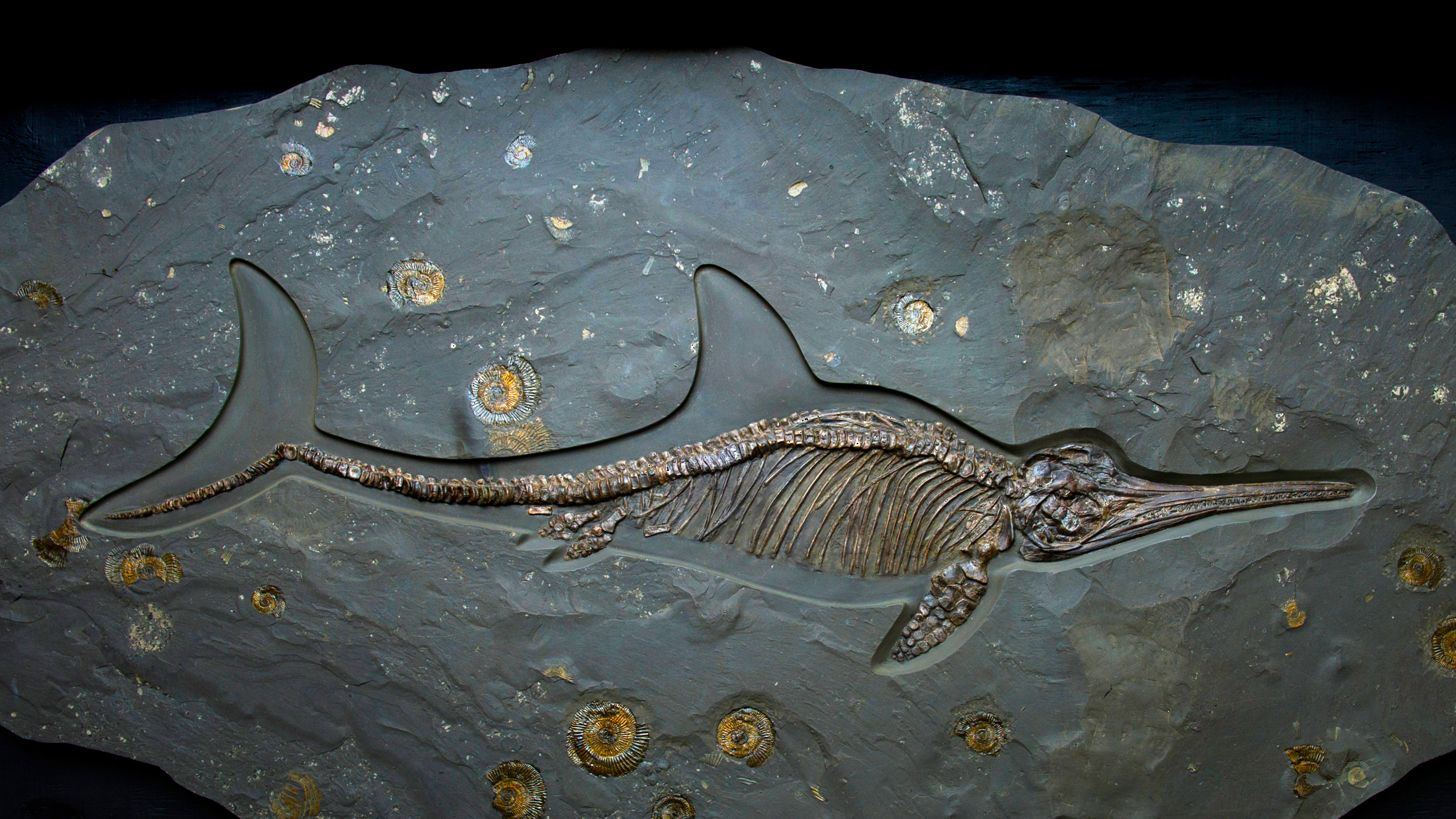 An ichthyosaur fossil of the Jurassic period, Dinosaurland Fossil Museum, Lyme Regis, Dorset, England (© Christopher Jones/Alamy)